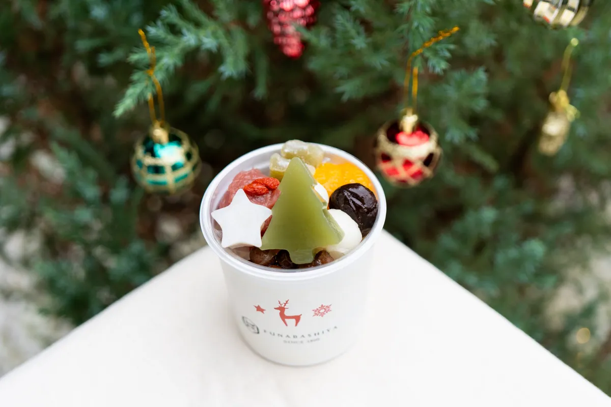 毎年冬に市場に登場する「クリスマスあんみつ」は、船橋屋ならではの伝統的な製法を活かしながらも、クリスマスを象徴する要素がしっかりと盛り込まれています。例えば、星型のくず餅やツリー型の抹茶羊羹、いちご餡、白玉など、鮮やかな色合いとともに、味の多様性も楽しめる一品です。