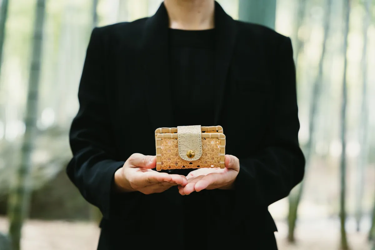 このカードケースは、竹細工職人の宮坂美穂氏とのコラボレーションによって製作されました。宮坂氏は、アパレルデザイナーとしてのキャリアを経て、竹工芸に魅了されるようになり、手間を惜しまずに丁寧な手作業でアイテムを創り出しています。彼女の作業には、竹の切り出しから油抜き、編み上げまでが含まれており、それぞれが彼女の情熱と技術を反映しています。