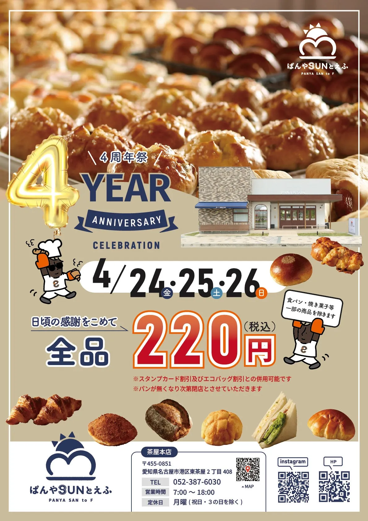 名古屋市のベーカリー「ぱんやSUNとえふ」茶屋本店が、4周年を祝う特別なイベントを開催します。4月24日から4月26日までの3日間、全品220円(税込)という特別価格でお楽しみいただけます。日頃の感謝を込めて、様々な種類の焼き立てパンをこの機会にたくさんの方に味わっていただけるチャンスです。