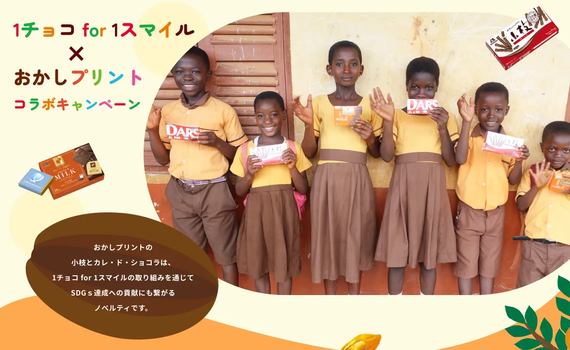 「1チョコ for 1スマイル」は、これまでに約3億3,857万円の寄付を実現してきた森永製菓の長期的なプロジェクトです。2023年10月1日から2024年2月14日までの期間中に、「おかしプリント」で販売される「オリジナル小枝」と「オリジナルカレ・ド・ショコラ」の売り上げ1個に対して、1円をカカオ産地の子どもたちの支援に寄付します。
