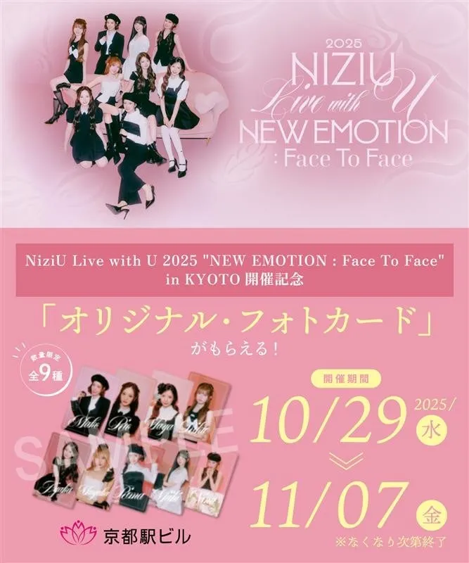 2025年11月6日(木)に、NiziUのライブ「NEW EMOTION: Face To Face」3が京都のロームシアターで開催されます。この特別なライブを祝して、京都駅ビルグループではNiziUとのコラボキャンペーンを開催します。この機会に、NiziUファンの皆さんに向けた特別な体験をお届けします。