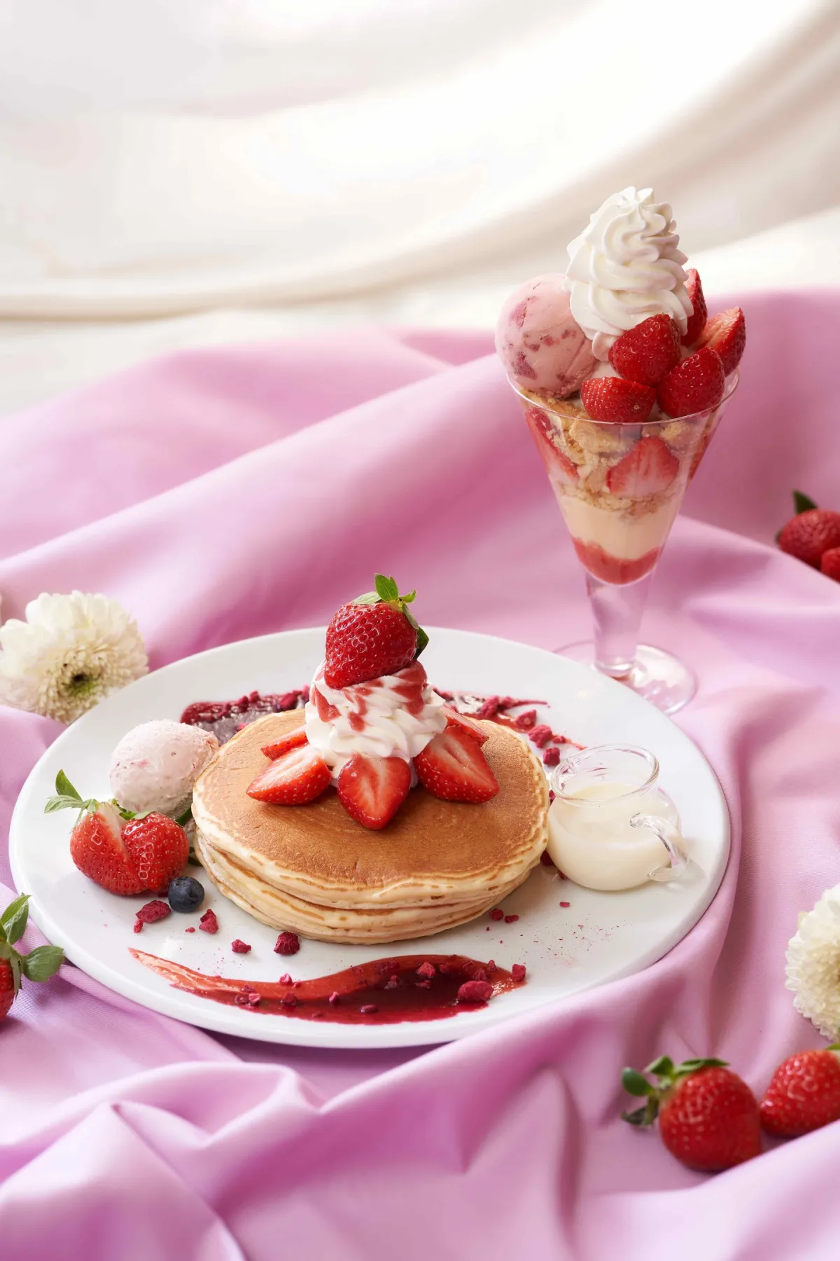 さらに、人気メニューの「苺のパンケーキ」もぜひお試しください。ふわふわのミルクパンケーキにあまおうをたっぷりトッピングし、温かい練乳ソースがいちごの甘酸っぱさと絶妙にマッチします。自家製のあまおうアイスやベリーソース、あまおうソースとともに楽しむことができ、食べるたびに幸せを感じるひとときに。
