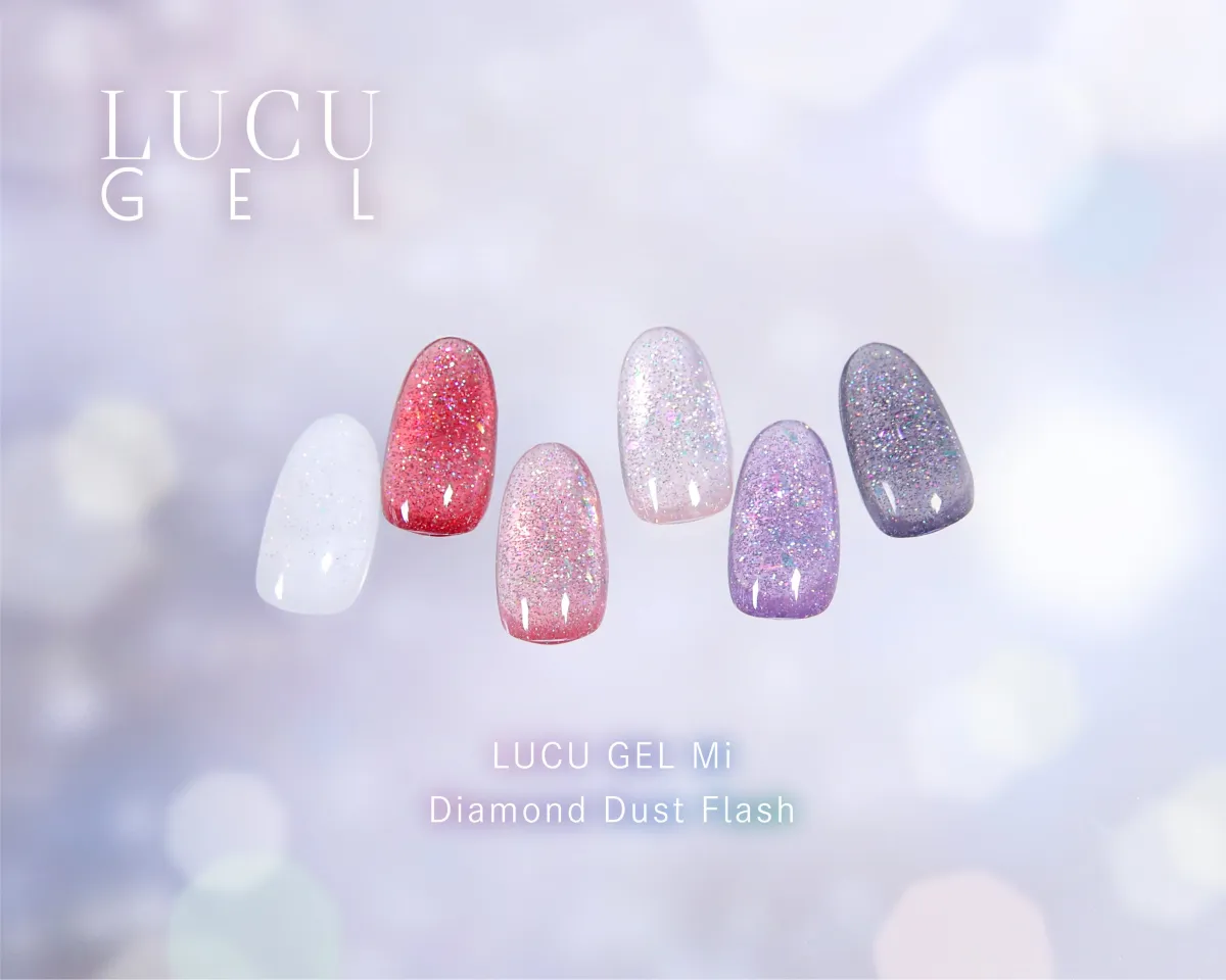 加えて、「LUCU GEL Mi」に新登場するフラッシュジェルシリーズ『ダイヤモンドダストフラッシュ』も見逃せません。幻想的に煌めく6色は、冬の空気に舞う氷晶をイメージし、自然光の下では透明感あふれる美しさを、フラッシュやライトの下ではまさに夜空の星々が光るかのような輝きを演出します。このフラッシュジェルを指先にまとわせれば、あなたの手元は一瞬で特別な瞬間となるはずです。