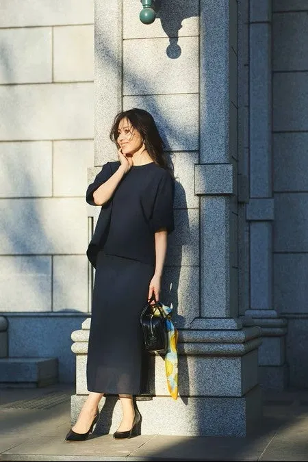 そして、ブラウスに合わせたのがタイトスカート。こちらも「大人ネイビー」を基調にしており、一見ベーシックなアイテムですが、実は二重構造というこだわりのデザイン。上にリネンライクなシアー素材を重ね、その裾からほんのり透け感を楽しむことができます。これによって、今っぽさが加わり、軽やかさも演出。着用時の快適さにも配慮されており、ストレッチ性がありながらタイトなデザインを実現しています。