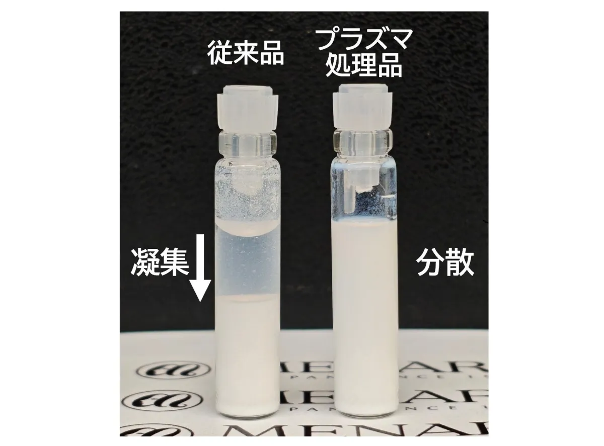 このような中、メナードが開発した液面プラズマ分散技術は、液体の表面にプラズマを発生させることで、微粒子酸化チタンのような原料を水中に安定的に分散させる革新的な方法です。この技術により、分散剤なしでも高い分散安定性を保ちながら、肌に優しい紫外線ケアが実現されました。