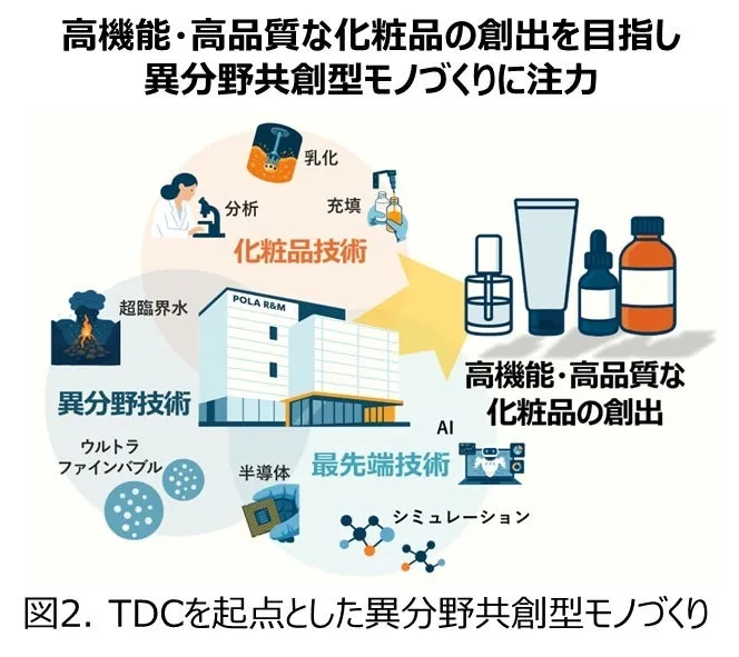 ポーラ化成工業は、TDC(Technical Development Center)を拠点に異分野共創型のモノづくりに注力し、高機能で好印象な化粧品を実現することを目指しています。分子動力学や量子力学に基づくシミュレーション技術を用い、高輝度放射光施設NanoTerasuを活用して分子挙動を可視化し、革新的な化粧品開発を進めています。