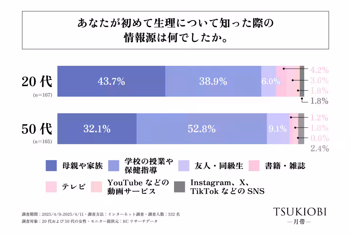 - - 情報源の違い: 20代の女性は初めて生理について知った際の情報源として「母親や家族」を最も多く挙げており、その割合は43.7%。対して、50代の女性は「学校の授業や保健指導」が52.8%と高めでした。このことから、20代の女性は家庭内でのオープンなコミュニケーションが進んでいることが伺えます。
