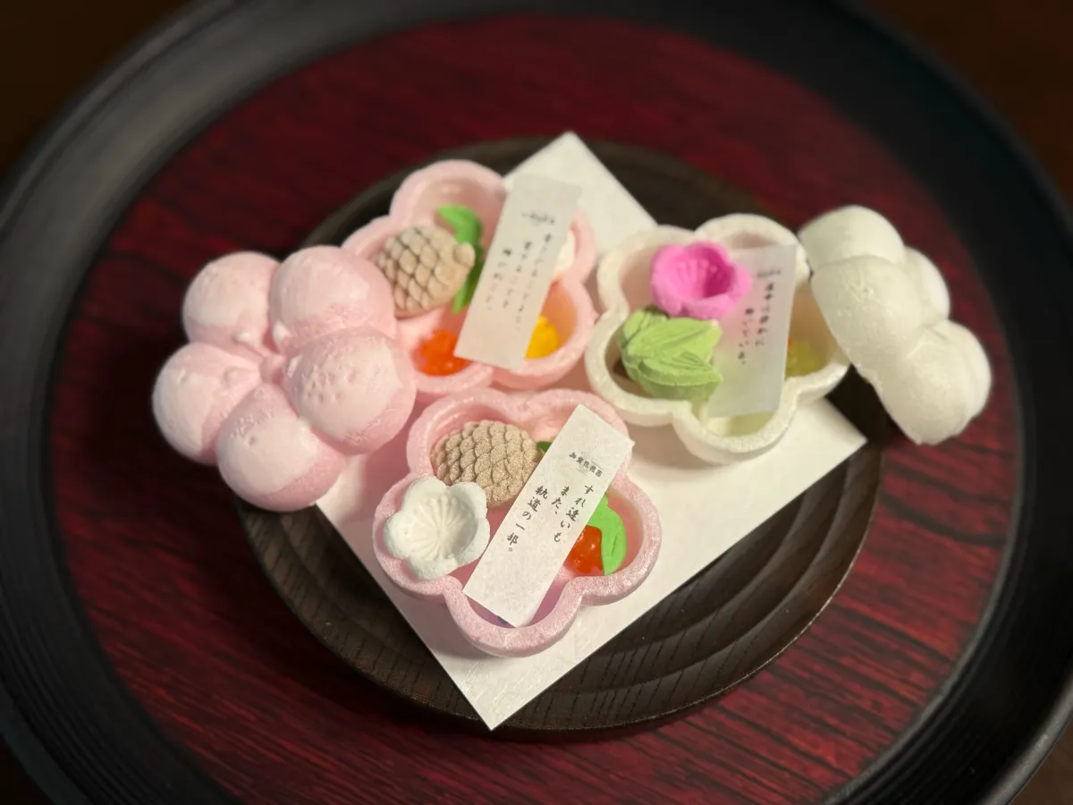 「園香」は、加賀前田藩の梅鉢紋を模したもなかです。その中には、可愛らしい干菓子とともに、オリジナルの恋占いが入っています。もなかを開けると、小さな驚きが待っています。このスイーツは、全国的に注目される老舗和菓子店「御菓子調進所 山海堂」の職人により、一つひとつ丁寧に作られており、その味わいと美しさは多くの人々に愛されている逸品です。