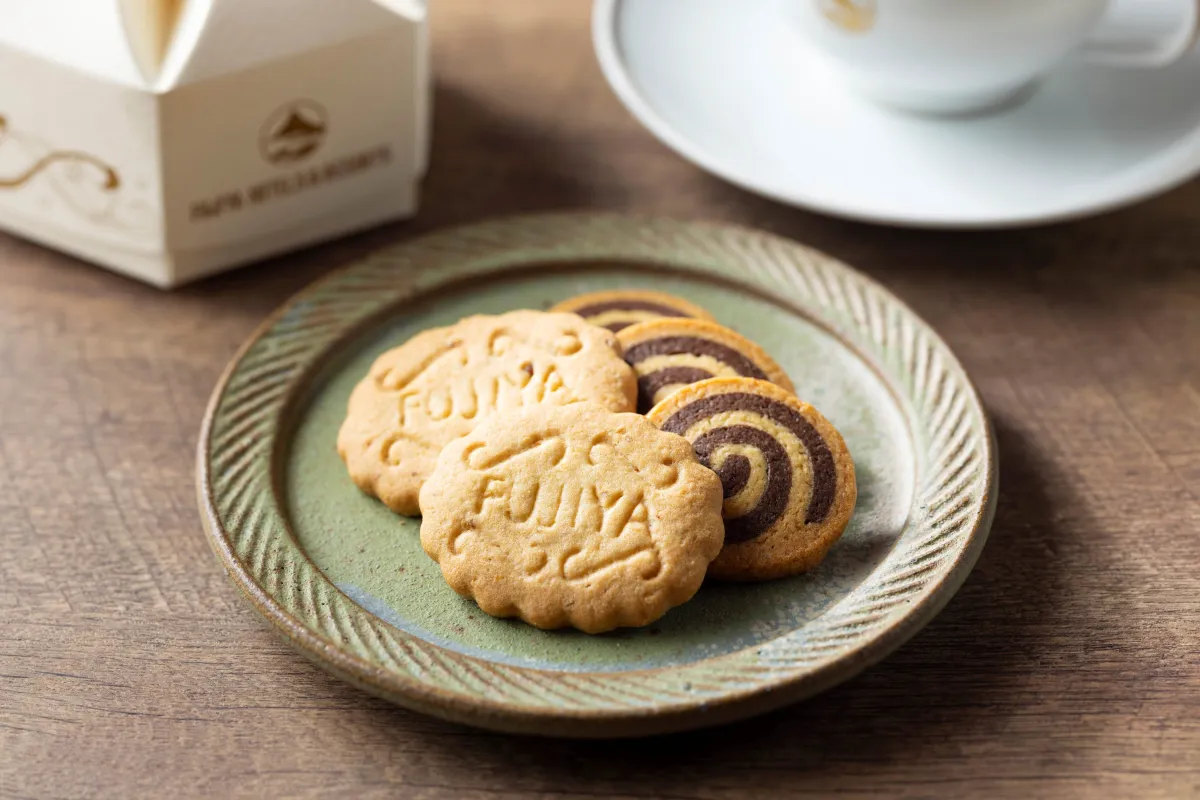 - - メープル風味:『FUJIYA』の文字が型押しされた、甘さ控えめで風味豊かなクッキー。