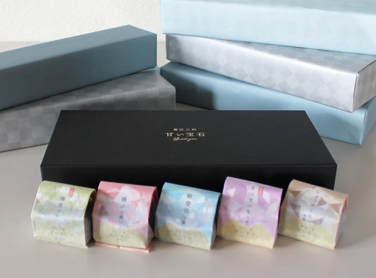 『甘い宝石』は、ただの羊羹ではありません。地元の特産品を活かしたユニークな味わいが楽しめます。フレーバーは、\- 能登塩 \- 金沢さつまいも \- 極み \- 金沢棒茶 \- しょうゆくるみ から選べ、各フレーバーはその旨味を最大限に引き出すために厳選されています。