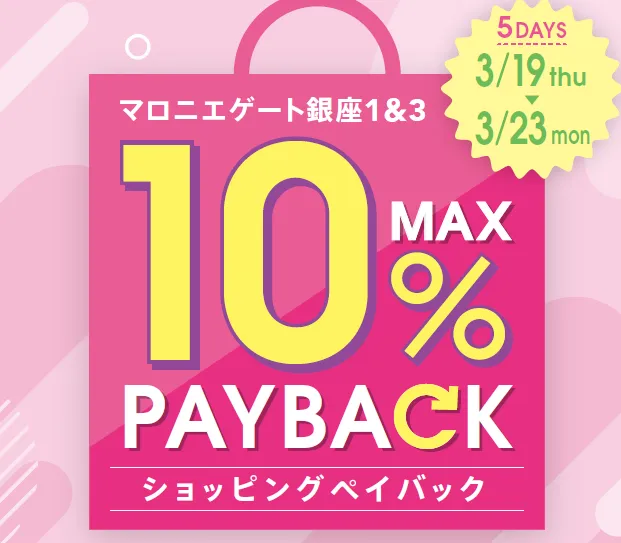 マロニエゲート銀座1のB1Fから9Fまでの店舗(3Fのスターバックスコーヒーと4Fのシープラプレミアムは除く)と、マロニエゲート銀座3のB2Fから2Fまでの店舗が対象です。ただし、いくつかの対象外商品がありますので、詳細は各店舗で確認してください。
