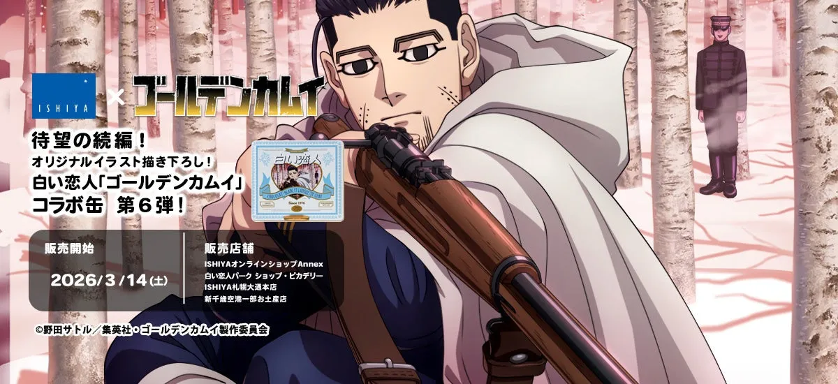 待ちに待った、北海道を舞台にした冒険アニメ『ゴールデンカムイ』とのコラボボックスが登場します。2026年3月14日(土)、数量限定で発売される「白い恋人36枚入『ゴールデンカムイ』コラボ缶」は、特別なイラストが印刷されたパッケージで登場。