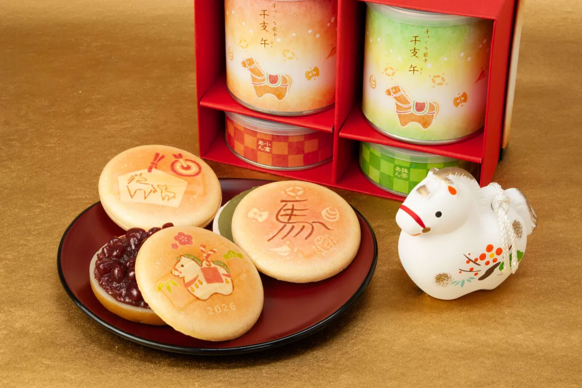 馬は古くから人々の生活の中で重要な存在とされ、豊かさや活力の象徴とされています。跳ねる姿は神々の使者とも崇められるほど。そんな午をポップで親しみのあるデザインに仕上げ、まんまるの最中種にちりばめた「手づくり最中」の数々が、美しい新年の飾りとなるでしょう。