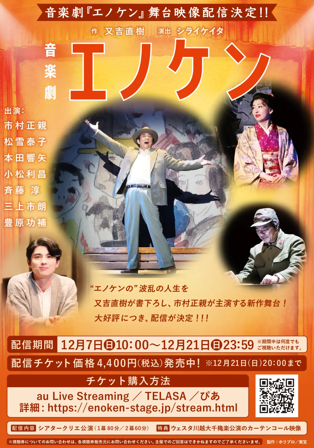 2023年の冬、音楽劇『エノケン』がついに配信されます。この特別な公演は、12月7日(日)から21日(日)までの期間限定で、舞台本編と大千穐楽カーテンコール映像が楽しめます。