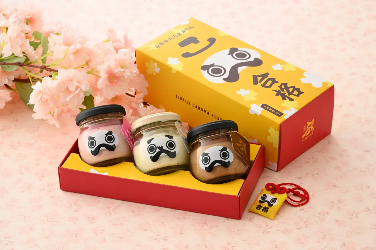 「合格だるまぷりんセット」は、選び抜かれた3つのフレーバーを収めています。それぞれ、受験に挑む力を与えるものとして特別にデザインされています。