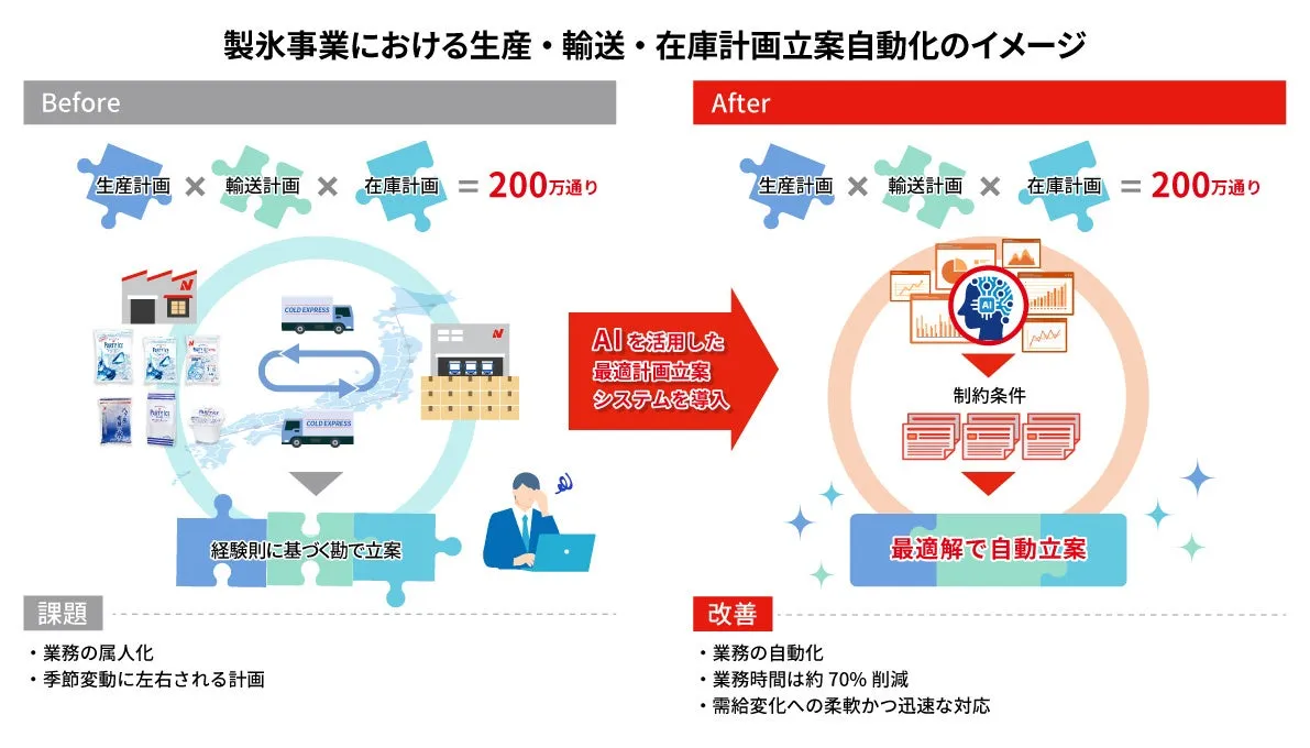株式会社ニチレイフーズの製氷事業を展開するニチレイ・アイスは、最近、日立製作所との協力によって新しいAIシステムを開発しました。このシステムは、包装氷の生産、輸送、在庫計画を効率的に行うためのものであり、業務効率化と働き方改革を可能にするものです。
