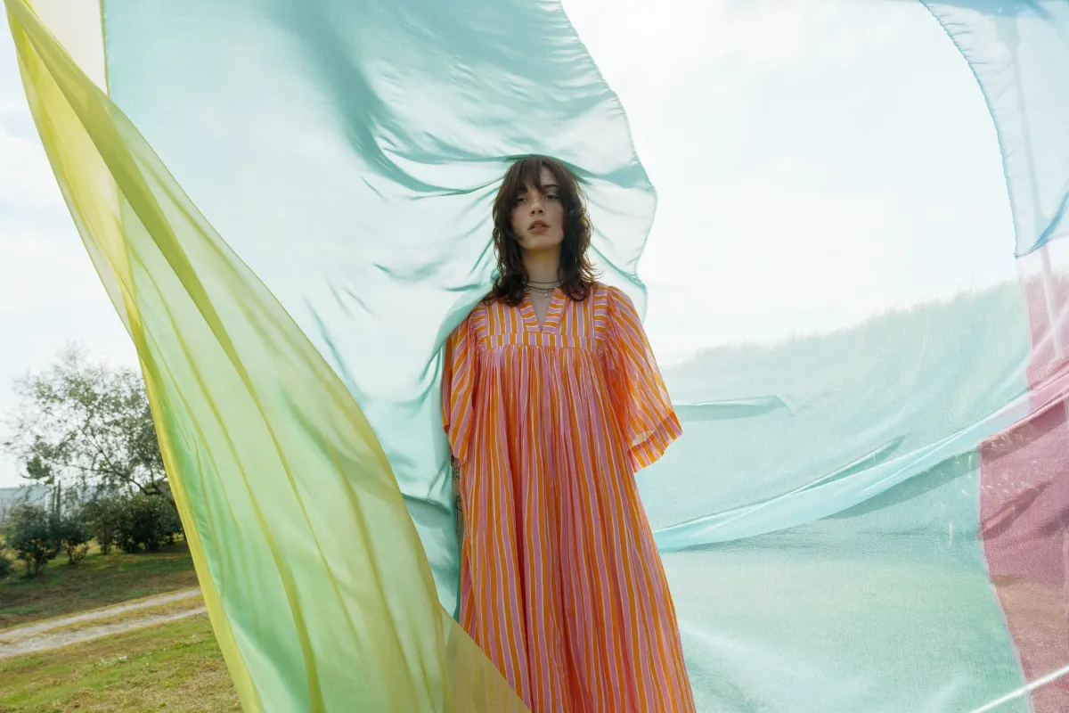 「Festival Express」とは、1970年代に実際に行われた音楽の旅を描いたもので、世界的に有名なアーティストが集まり、自由なムードの中で音楽を楽しんだイベントです。Sara mallikaのSummer Collectionもこの精神を受け継いでおり、色彩豊かでプレイフルなデザインが特徴的です。たとえば、陽気なストライプ柄のギャザードレスやセットアップは、リズミカルな配色で、見る人に高揚感を与えます。