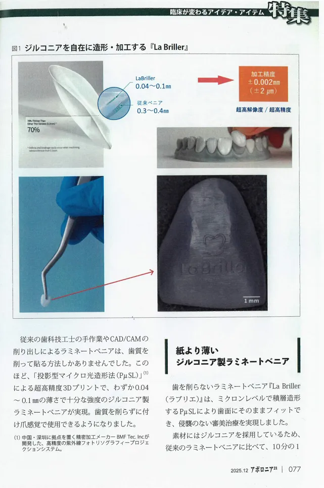 最近、ナノイズムジャパン株式会社が開発したジルコニア超精密加工技術「La Briller」が、歯科医療専門誌『アポロニア21』の2025年12月号に掲載されました。この技術は、ジルコニアを自在に造形・加工することができ、特に超高精度のジルコニアラミネートベニアを実現するものです。