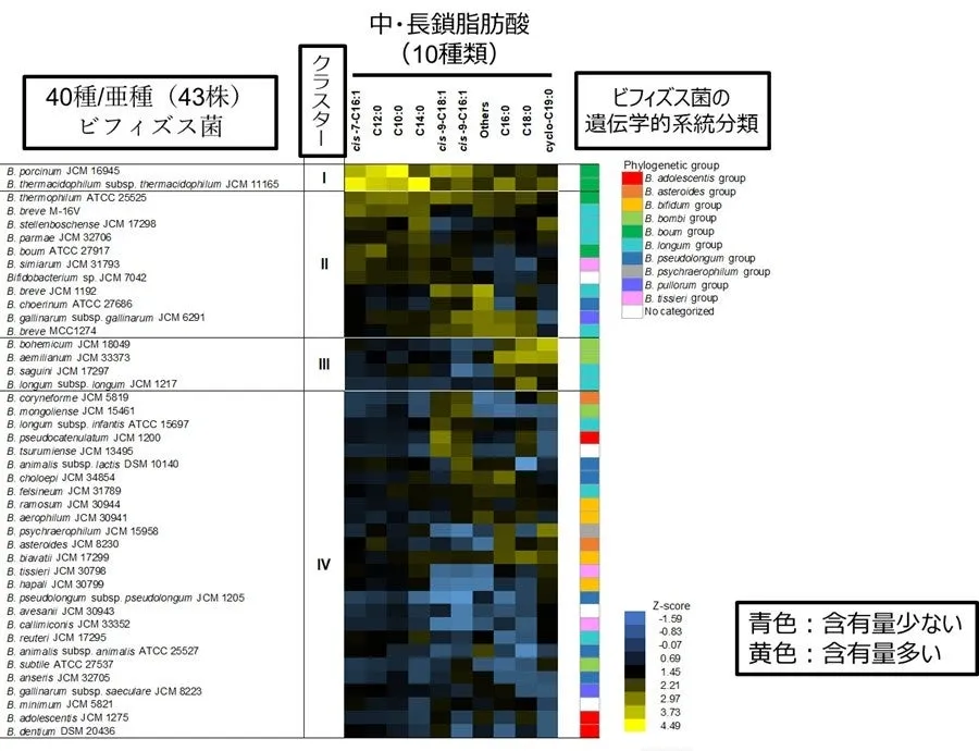 今回の研究では、43種類のビフィズス菌株を対象に、それらの細胞内に含まれる中鎖・長鎖脂肪酸のプロファイルを定量解析しました。結果として、ビフィズス菌は菌株ごとに異なる脂肪酸の組成を持ち、これを4つのグループに分類しました。特に注目すべきは、Bifidobacterium boumグループに属する菌株が高レベルの脂肪酸を含有していた点です。
