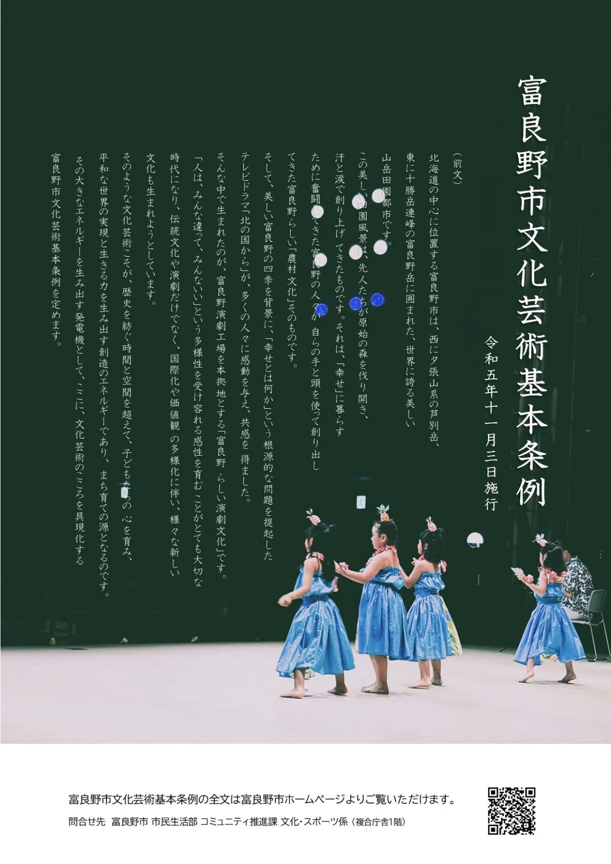 北海道の中心に位置する富良野市は、四季折々の自然が美しい地域であり、文化芸術が花開いてきました。近年、富良野市は「文化芸術基本条例」を施行し、市民の文化的権利を明確にし、持続可能な地域社会を目指す取り組みを進めています。この条例は、文化芸術を通じて市民の創造性を育むことを目的としており、地域の文化をさらに豊かにすることを狙いとしています。
