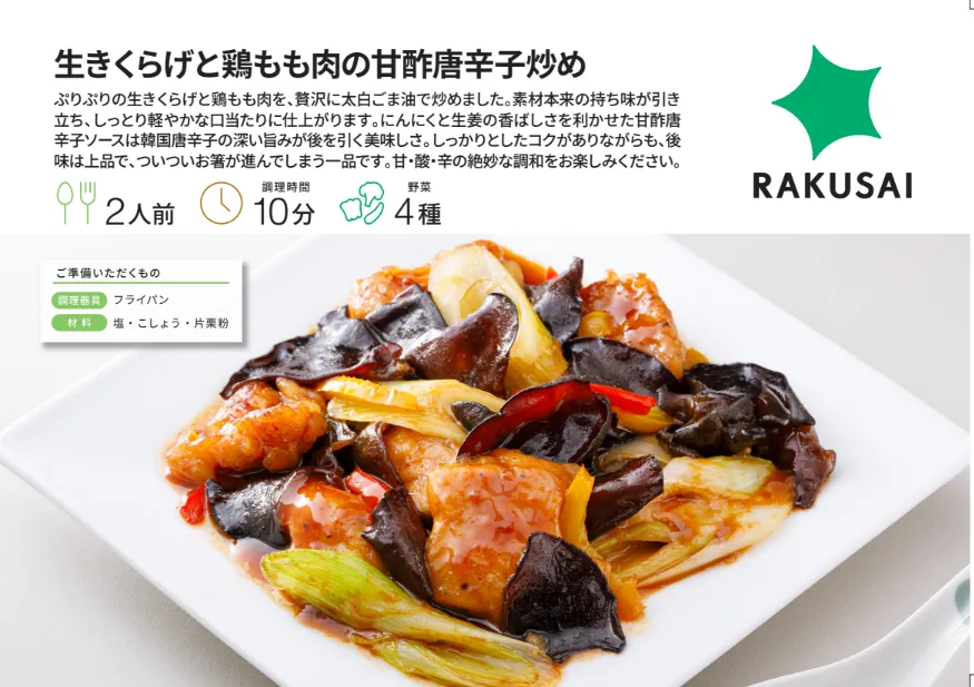 楽彩株式会社が手掛けるミールキットブランドRAKUSAIより、待望の新メニュー『生きくらげと鶏もも肉の甘酢唐辛子炒め』が2026年4月27日(月)に販売開始されます。この料理は、ぷりぷりの生きくらげに、ジューシーな鶏もも肉を合わせた、味わい深い一品です。