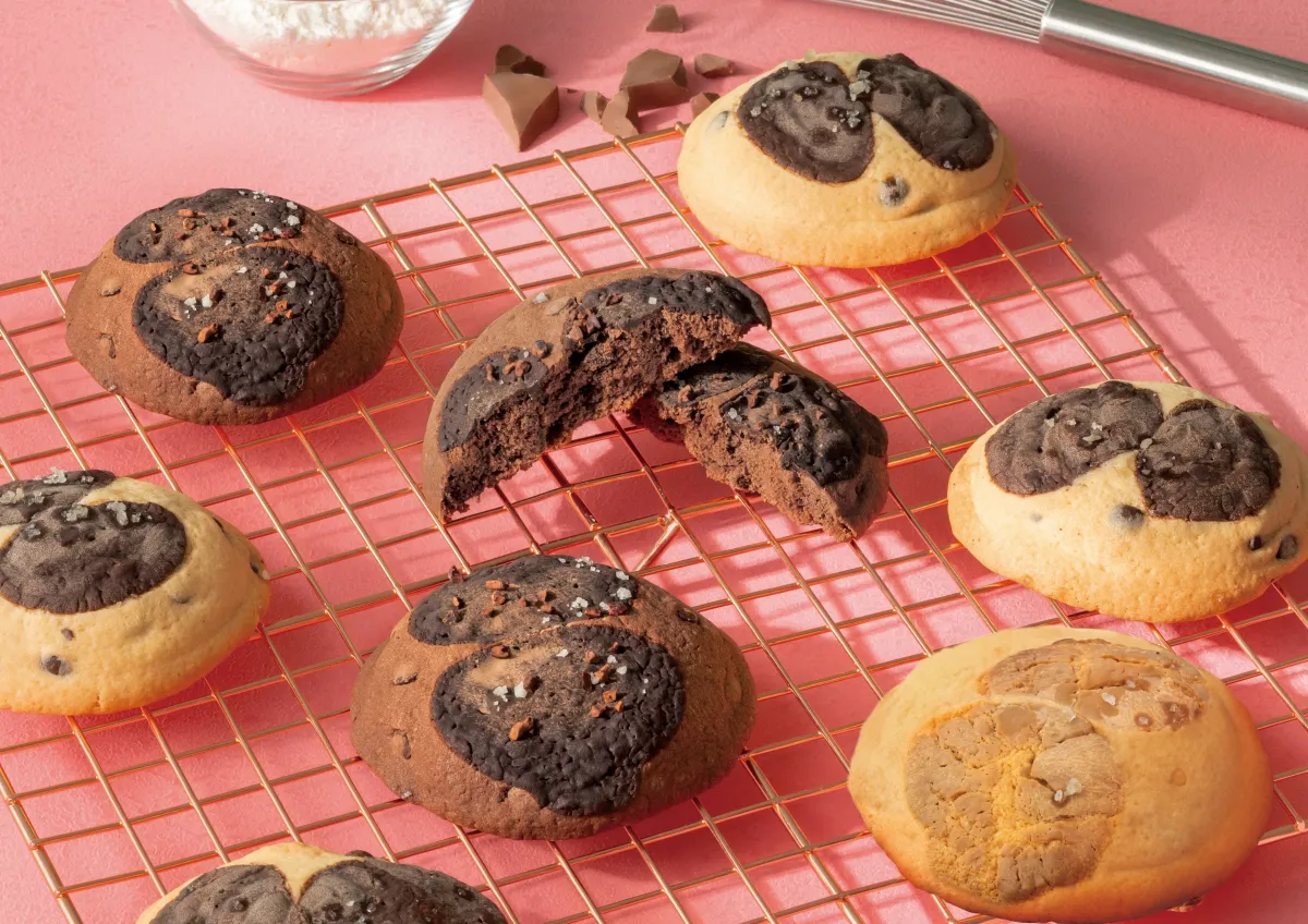 ダブルチョコレート:ココア生地とチョコレートチップに、ベルギー産のカカオ73%チョコレートをトッピング。苦みとコクが特徴のチョコレート尽くしです。