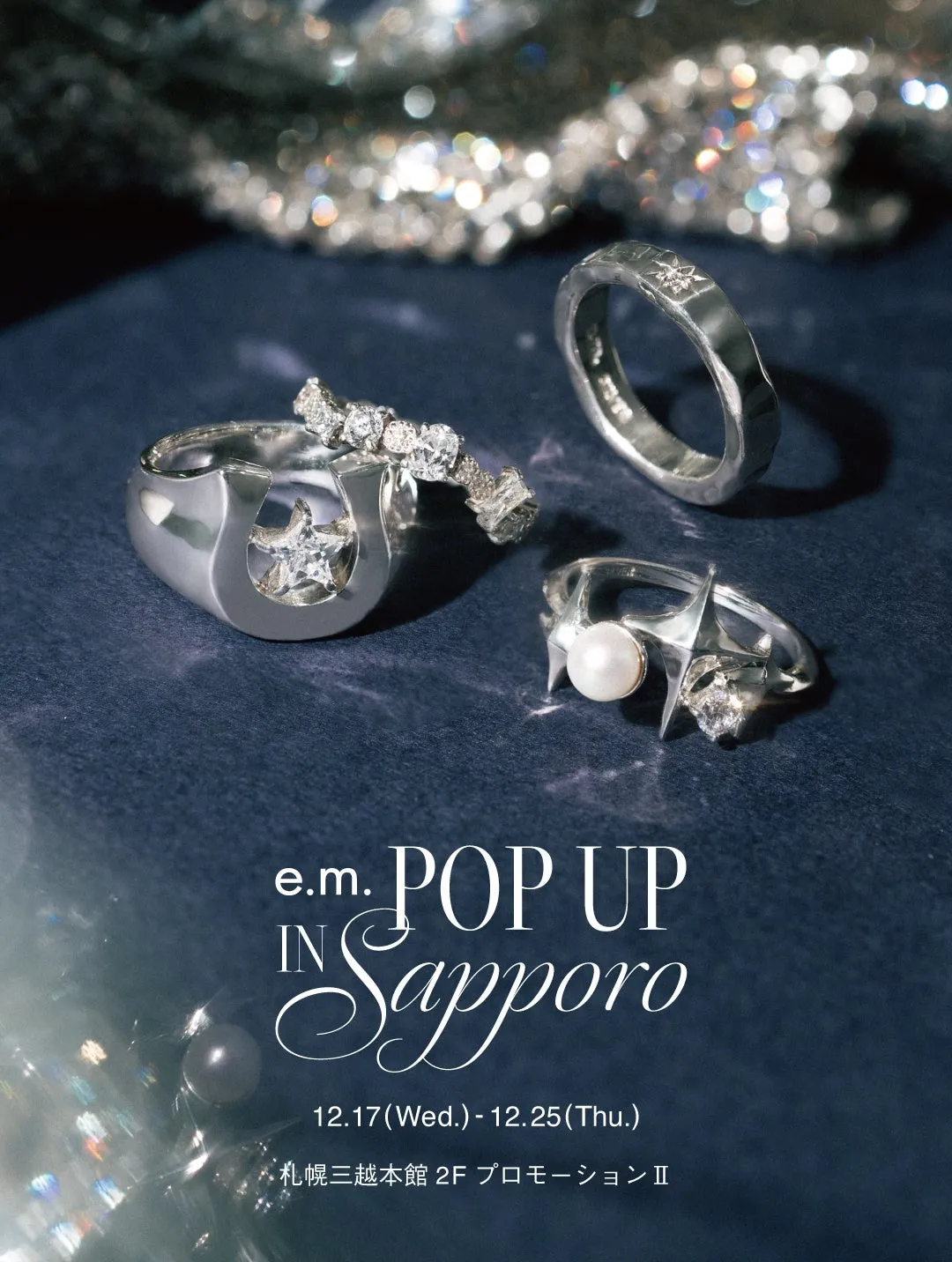 ジュエリーブランド「e.m.」が、2025年12月17日から12月25日までの期間、札幌三越にてPOP UPイベントを開催します。北海道では直営店舗が存在しないため、毎年恒例となるこのイベントは、地元のジュエリー好きにとって待望の機会です。
