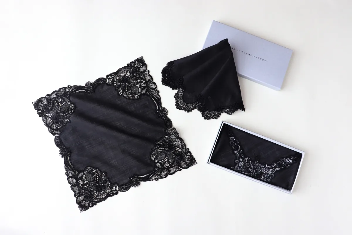 これまで同店では黒レースのハンカチが幾つか展開されてきましたが、フォーマルな場にふさわしい“定番”として位置づけることにより、より多くの人々に愛されることを目指しました。シンプルな装いに、エレガンスと個性を加えるこのハンカチは、特別な席や日常使いのどちらにも適しています。