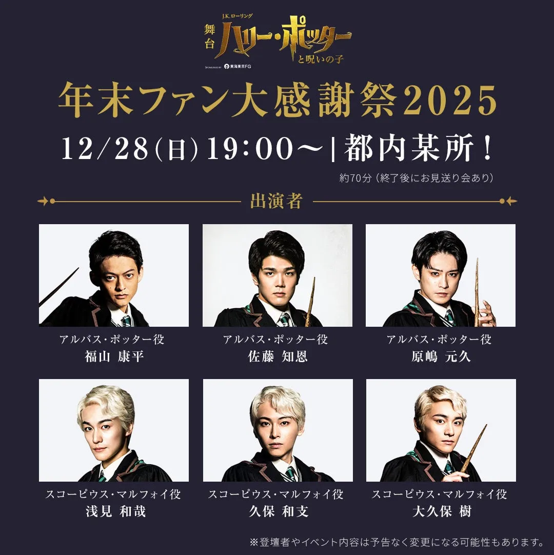 感謝祭は19時から約70分間にわたり、アルバス・ポッター役の福山康平さん、佐藤知恩さん、原嶋元久さん、スコーピウス・マルフォイ役の浅見和哉さん、久保和支さん、大久保樹さんなど、豪華出演者が勢揃いします。ファンの皆さまにとって、彼らと直接触れ合える貴重な機会となるでしょう。