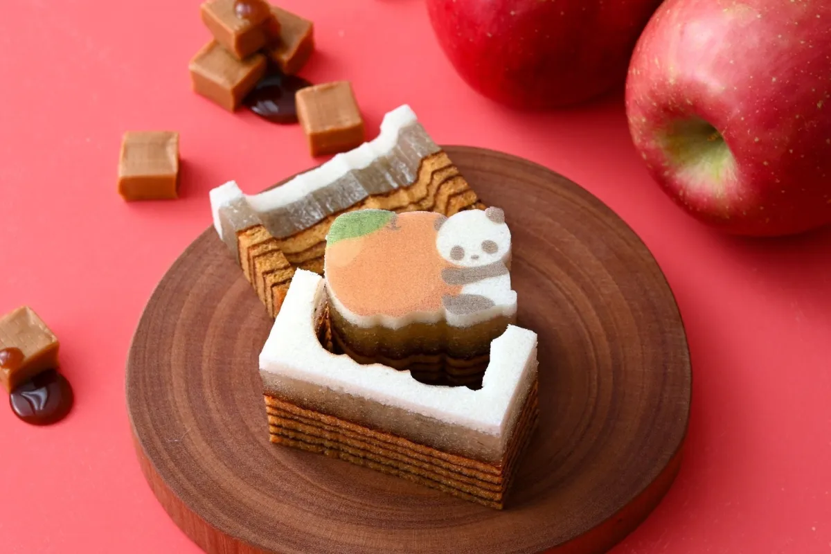 今回一際注目の新作、「パンダのゼリーバウム(りんご&キャラメル)」は、型ぬきの楽しさと爽やかな食感を兼ね備えた一品です。キャラメルの香り漂うバウムクーヘンの中には、りんごゼリーがサンドされています。口に入れると、ふわふわの生地とぷるんとしたゼリーが一体となり、秋を感じる優しい甘さが広がります。また、その見た目も愛らしく、りんごを抱くパンダのデザインが施されており、食べる前から楽しませてくれます。