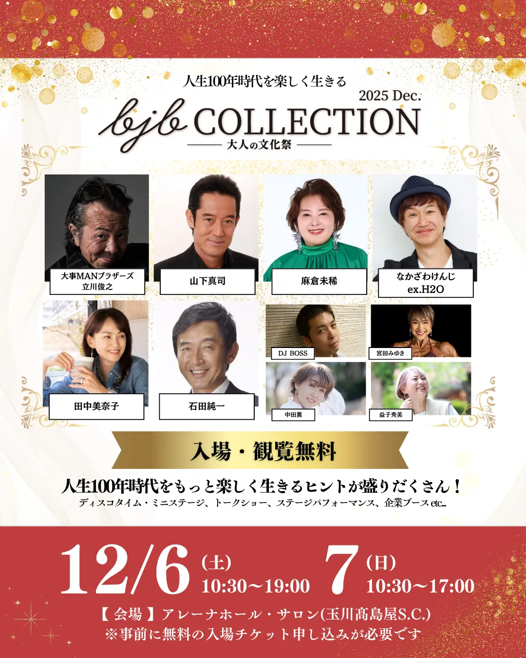 「bjbCOLLECTION 2025 Dec.」では、バブル世代が青春を共に過ごした様々な豪華ゲストが登場します。具体的には、山下真司さん、大事MANブラザーズの立川俊之さん、麻倉未稀さん、なかざわけんじさん、田中美奈子さん、そして石田純一さんなど、実力派の登壇が予定されています。それぞれのトークショーやミニライブなど、多彩なコンテンツが用意され、ノスタルジックな気持ちと共に新たなインスピレーションが得られることでしょう。