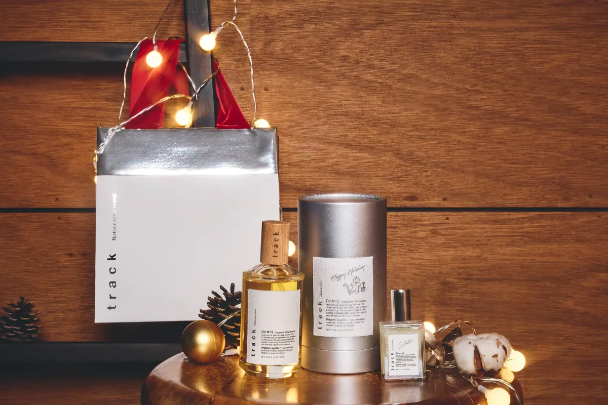 trackの人気製品「track Oil No.3」は、特別なホリデーパッケージでの登場です。通常のアイボリーパッケージから一新し、シルバーの艶やかなデザインに。さらに、キュートなクリスマスのイラストが施され、手に取るたびに心が弾みます。このアイテムは贈り物にもぴったりです。