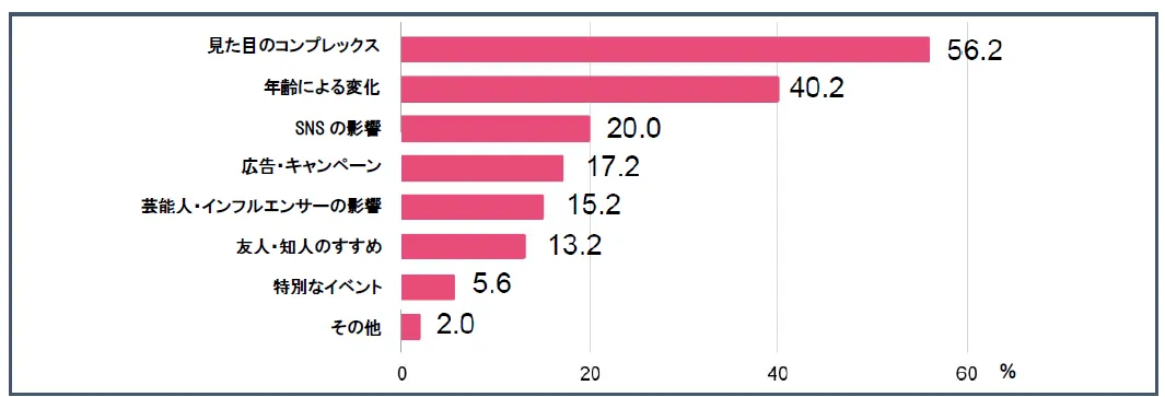 美容施術を受けるきっかけは、見た目に関するコンプレックス(56%)や年齢による変化(40%)が主な要因となっています。また実際に施術を受ける目的は、シミ・シワの改善(32%)や脱毛(26%)が多くの割合を占めていました。これらの結果は、美容医療が多くの人にとって、自己改善の手段として重要であることを示唆しています。
