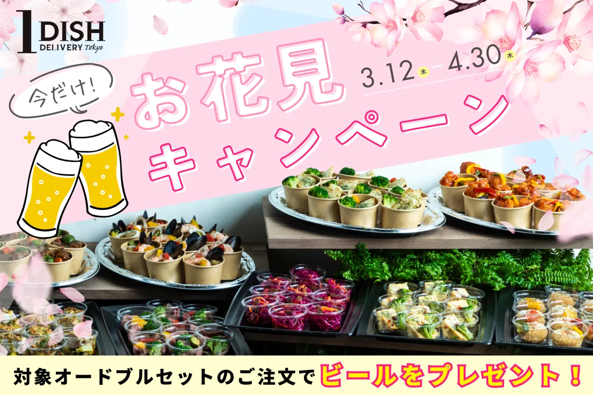 「ワンディッシュ」は、現在22都道府県で展開されている宅配オードブルサービスで、東京・横浜・大阪・名古屋・神戸・福岡を中心に、多彩な料理を提供しています。春の親睦イベントとして人気のお花見に特化したキャンペーンを行い、対象のオードブルセットには特典として缶ビールやソフトドリンクが含まれるお得なプランを用意しています。