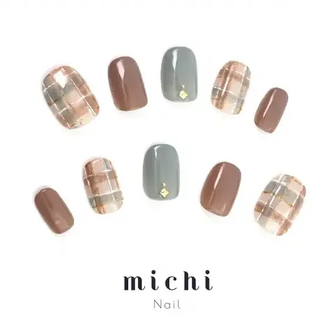 最後に紹介するのは、秋の雰囲気をふんだんに取り入れた「オータムチェックネイル」。ベージュブラウンとアイスグレーを基調に、チェック柄とゴールドラインをアクセントにしたデザインが特徴です。さりげないゴールドスタッズが上品さを引き立て、大人可愛い印象を与えます。これからの季節、秋の気分を楽しむのにもってこいのネイルですね。