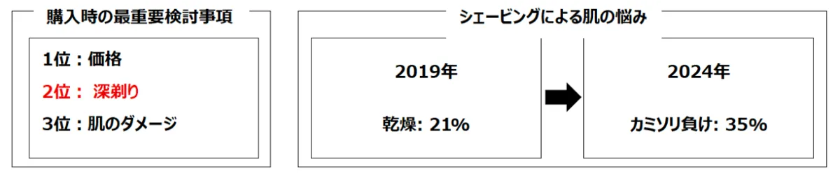 近年、男性のシェービングスタイルやニーズは大きく進化しています。特に、2024年の調査によれば、57%の男性が依然として電気シェーバーを好んで使用しており、身だしなみに対する意識がますます高まっています。しかし、その一方で肌トラブルに悩まされる男性も増加。シェービングによるカミソリ負けの悩みは、2019年の61%から2024年には74%に上昇し、多くの人々が深剃りと肌への優しさを両立させる方法を模索しています。