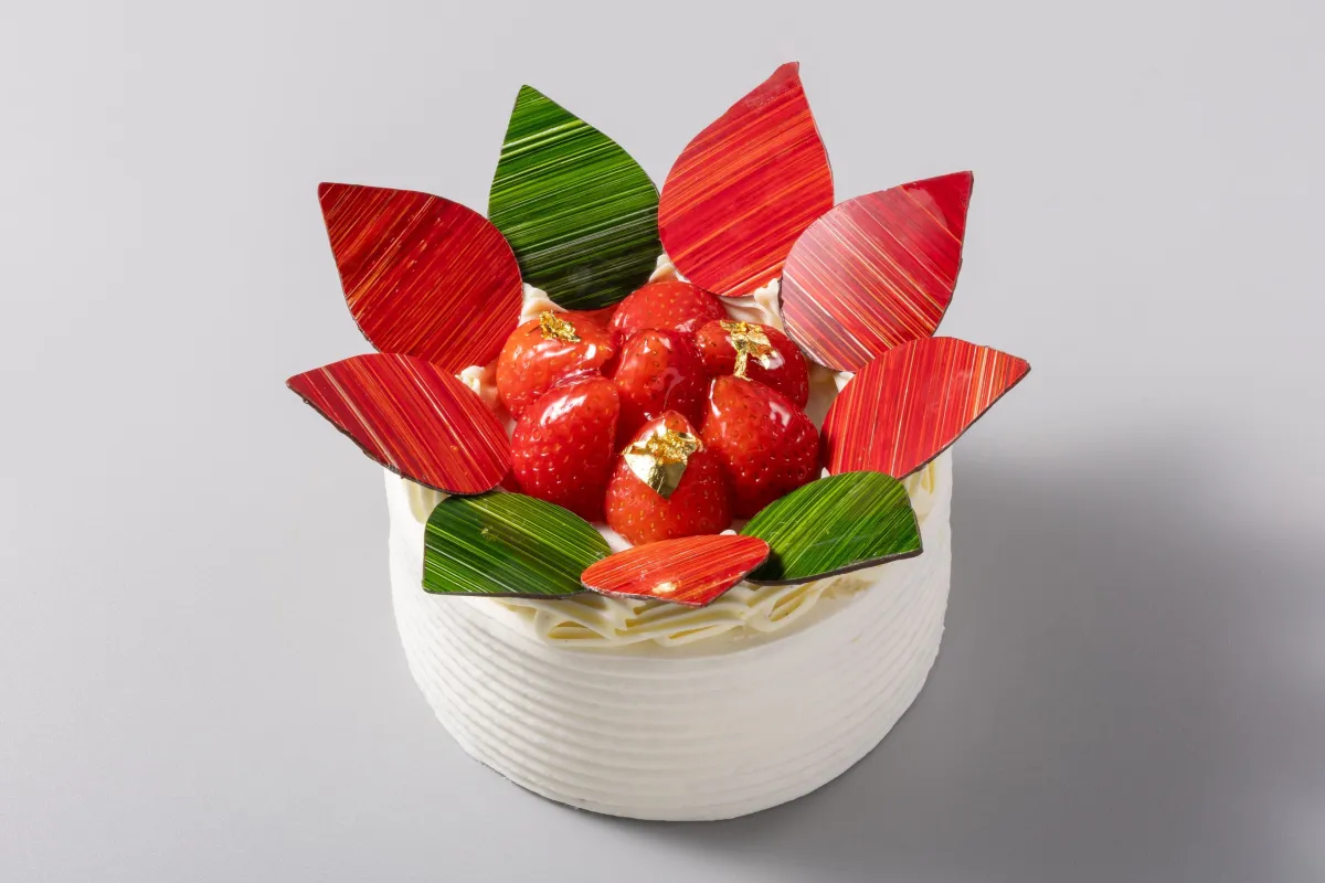 - 苺と北海道産の生クリームがたっぷり詰まった、優雅なホワイトチョコクリームケーキ。マダガスカル産のバニラビーンズを使用し、ポインセチアをイメージした美しいチョコレート装飾が魅力です。