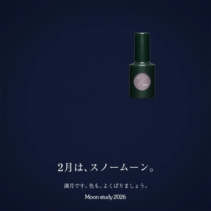 「uka Moon study 2/Feb」は、価格が¥2,750(税込)、内容量は10mLです。2月の満月「スノームーン」をテーマとしたこのネイルカラーは、浄化しながらも凛とした印象を与えるラベンダーグレー。まるで月明かりが夜空に映えるような美しいカラーです。