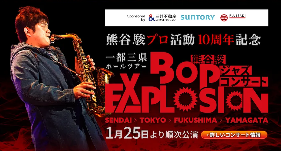 宮城県仙台市出身の熊谷駿は、バークリー音楽大学やニューイングランド音楽院で音楽を学んだ、若手ながら腕前は確かなサックス奏者です。「音楽×社会貢献」を掲げ、地域文化の発展にも力を注いでいます。「BOP EXPLOSION」は、彼の集大成とも言える意義のあるプロジェクトであり、新たな音楽の地平線を切り拓く第一歩となるでしょう。