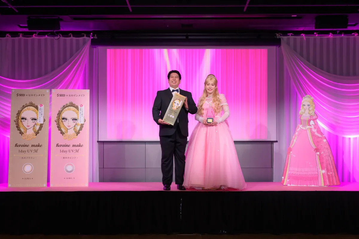 池田さんは、まるでヒロインメイクのキャラクター「エリザベート・姫子」を彷彿とさせるふんわりしたピンクのドレスで登場。グランプリ受賞の際、彼は「カラコンで新しい自分を発見できた」と目を潤ませながらコメント。彼の喜びは、そのまま新色カラコンの効果を体現していました。