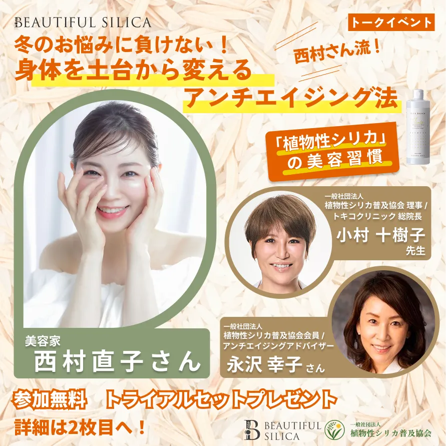 美容家・西村直子氏のトークイベントは、植物性シリカについての深い知識を得るための絶好のチャンスです。冬の季節に向けて、美への新しいアプローチを見つけたい方は、ぜひ参加してみてはいかがでしょうか。自身の身体を土台から見直すことで、長く続く美しさを手に入れる一歩を踏み出しましょう!