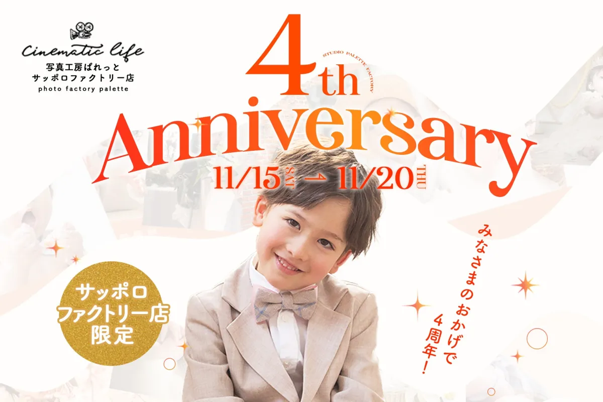 もうすぐ4周年を迎える「写真工房ぱれっと札幌ファクトリー店」では、感謝の気持ちを込めて特別なアニバーサリーセールを開催しています。この期間中には、お子様の大切な記念日を最高の形で残すための撮影プランが特別価格でご利用できます。