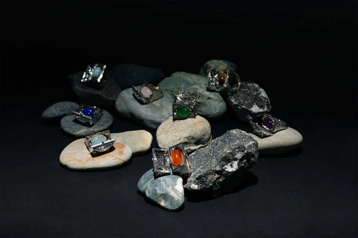 「Treasure box ring」は、PASS THE BATONのシンボルであるバトンを持った動物たちのデザインを取り入れています。リングの蓋を開くと、中からデッドストックの天然石を用いたもう一つのリングが現れる仕掛けが施されています。これにより、ひとつひとつ異なる表情を持つ天然石の魅力を存分に味わうことができます。