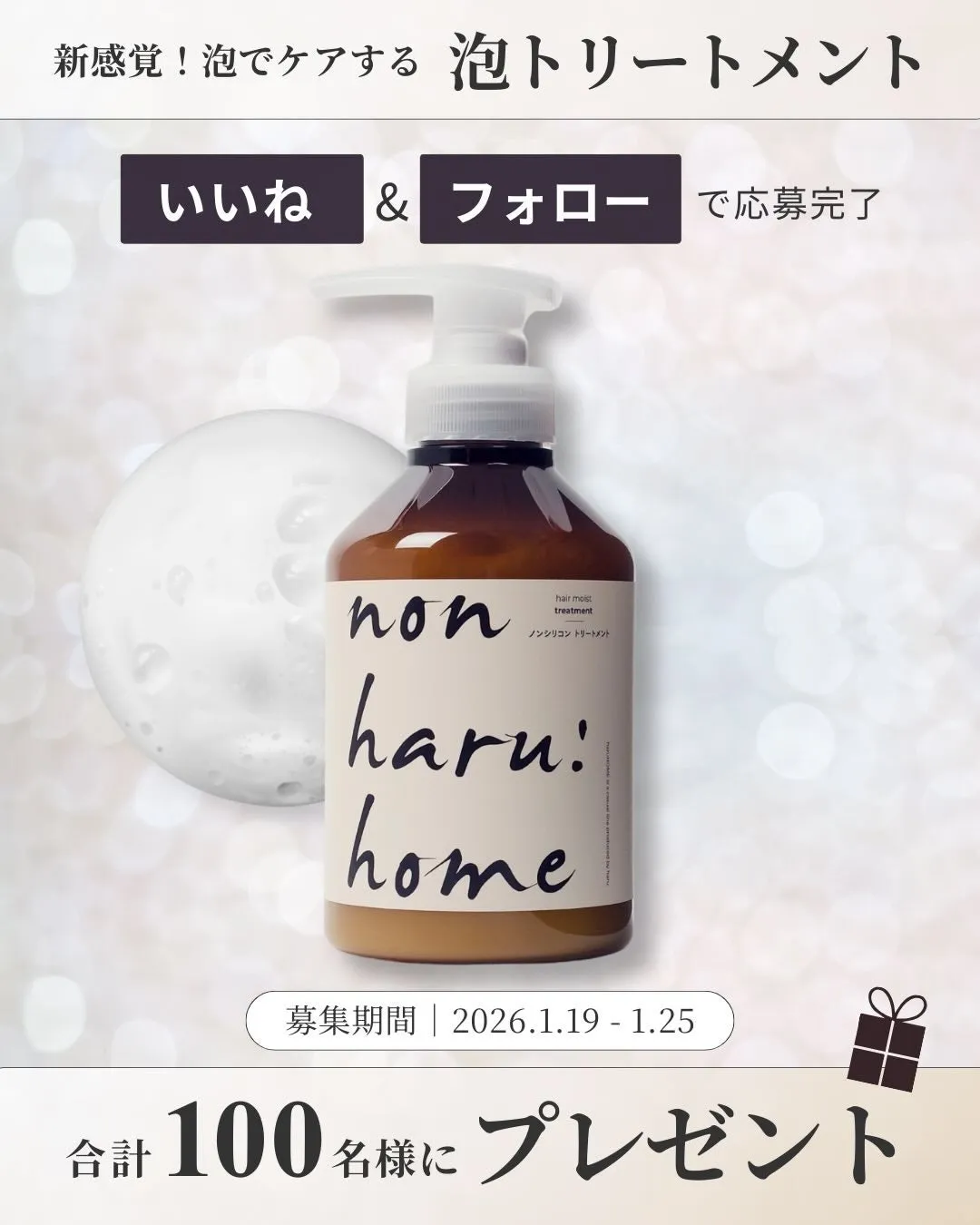 non haru:homeでは、InstagramやX、Threadsの公式アカウントをフォローし、いいねやリポストをすることで、「ヘアモイストトリートメント」を抽選で100名にプレゼントするキャンペーンを行っています。応募期間は2026年1月19日(月)から1月25日(日)までです。普段からヘアケアに気を使っているあなたに、ぜひこの機会に泡トリートメントを試してみてほしいと思います。