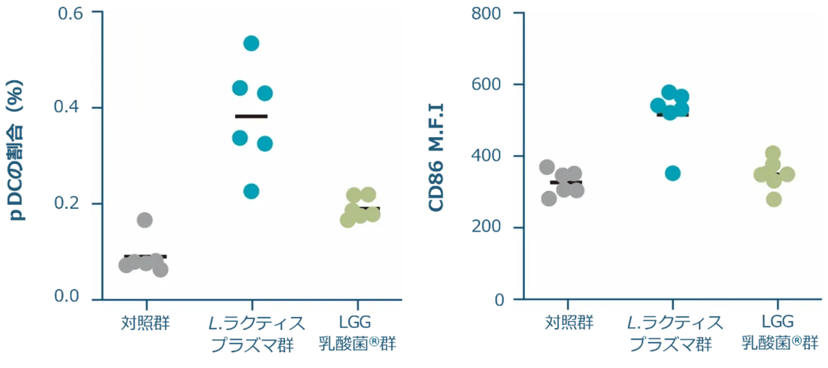研究の結果、「L.ラクティス プラズマ」を経鼻接種したグループは、LGG乳酸菌接種群に比べてpDCの割合やその活性化マーカーであるCD86の発現が増加し、6時間後には特に顕著な変化が観察されました。また、抗ウイルス遺伝子の発現も増加し、これはウイルスに対する防御機能が強化されることを示唆しています。