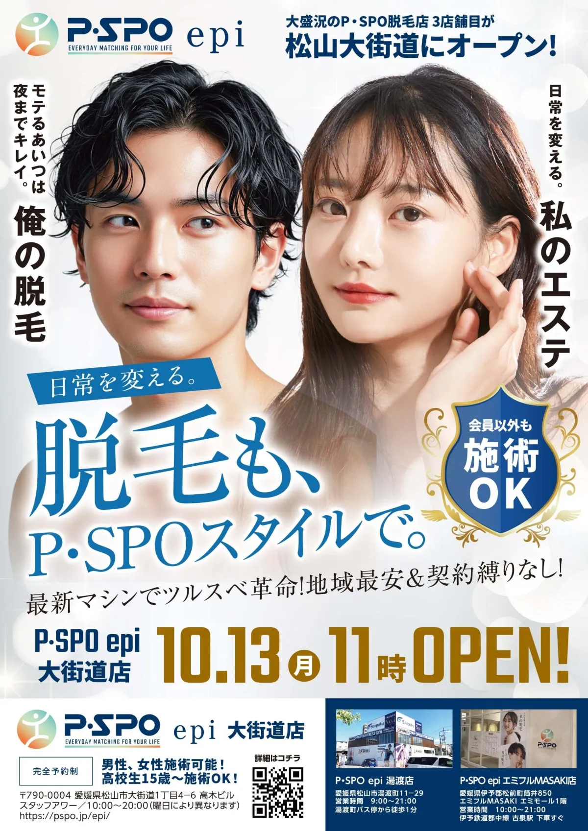 愛媛県松山市の中心、大街道に脱毛専門店『P・SPO epi 大街道店』が2025年10月13日(月)にオープンします。この新店舗は、アクセスが非常に便利で、心地よいリラックス空間の中で専門スタッフによる本格的な脱毛や美肌ケアが受けられます。