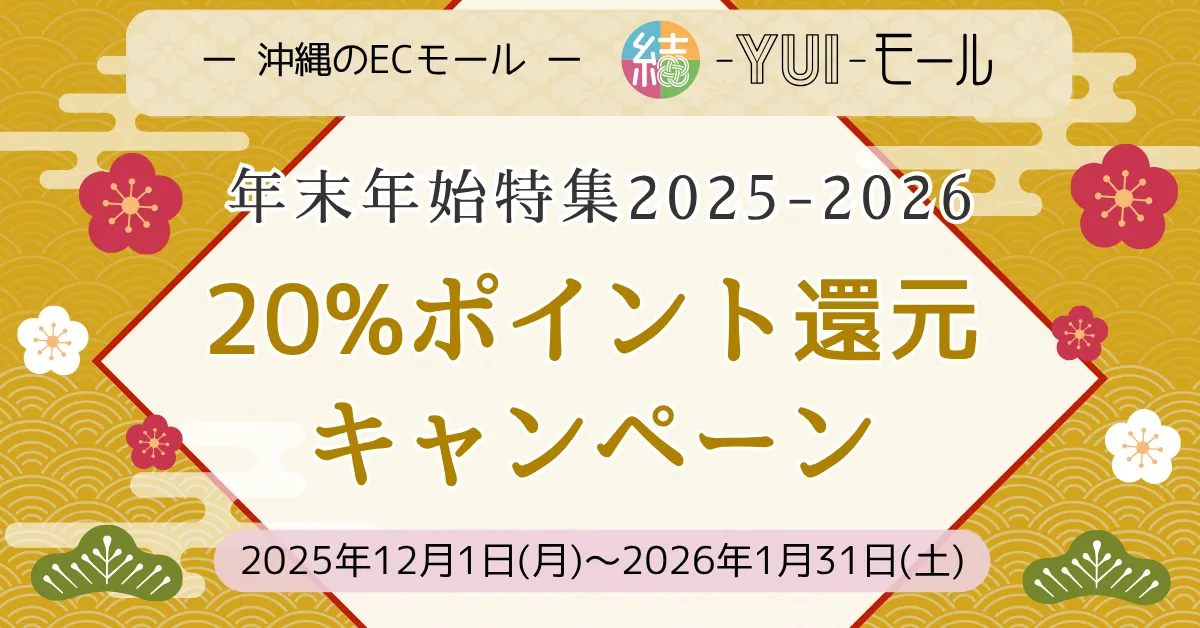 沖縄の特産品やグルメを取り揃えたECサイト『結-YUI-モール』が、2025年12月1日から2026年1月31日までの期間限定で、年末年始特集を開催します。これに合わせて、20%のポイント還元キャンペーンも実施中ですので、この機会を逃さずにぜひチェックしてみてください!