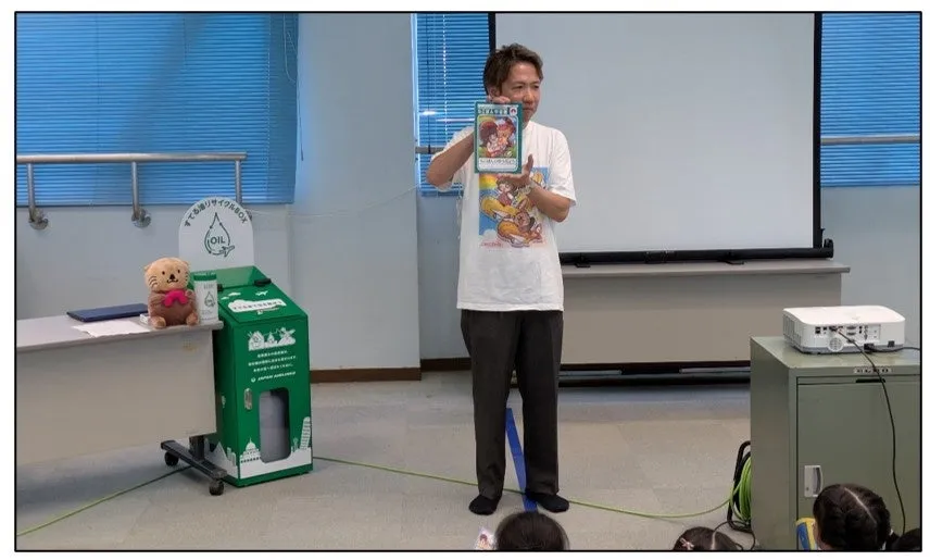 最後に、日本航空との連携により、廃食油のリサイクルについての授業が行われました。家庭からの使用済み油が、どのように持続可能な航空燃料『SAF』へと生まれ変わるのか、実物の回収ボトルを用いて説明しました。油の種類によるリサイクルの可否や、CO₂削減の影響についても学び、子どもたちの目が輝いていたのが印象的でした。