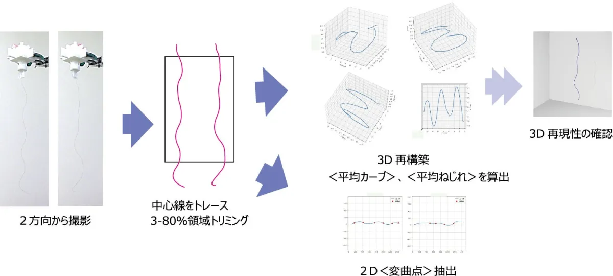 一丸ファルコスでは、毛髪一本一本の三次元形状データに基づき、うねりの印象を一つの数値として示す「WavyIndex」を開発しました。具体的には、毛髪の中心線から得られる「平均カーブ」「平均ねじれ」「変曲点数」という三つの指標を組み合わせて算出します。この新たな指標により、スタイリストや研究者が行ってきた官能評価と高い相関を持つことが確認され、評価のばらつきを大幅に改善することが期待されます。