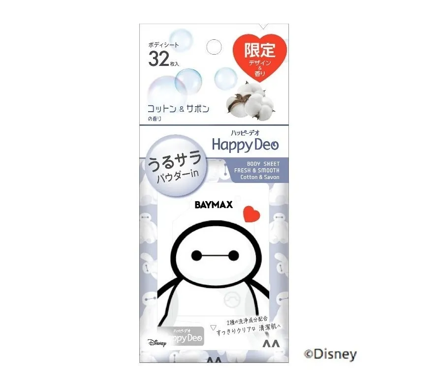 「マンダム ハッピーデオ ボディシート」は、ぽってりとしたフォルムと優しい色合いが特徴のベイマックスによるオリジナルデザインが施されています。子供から大人まで愛されるキャラクターが描かれていることで、使うたびにハッピーな気分にさせてくれること間違いなしです。